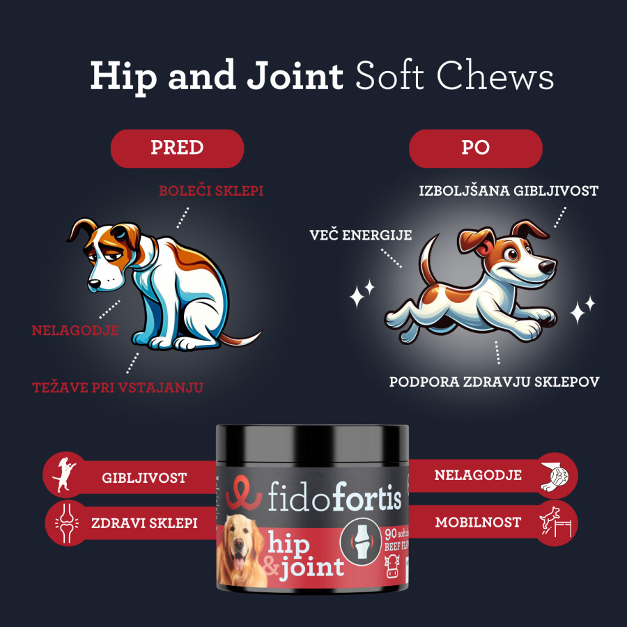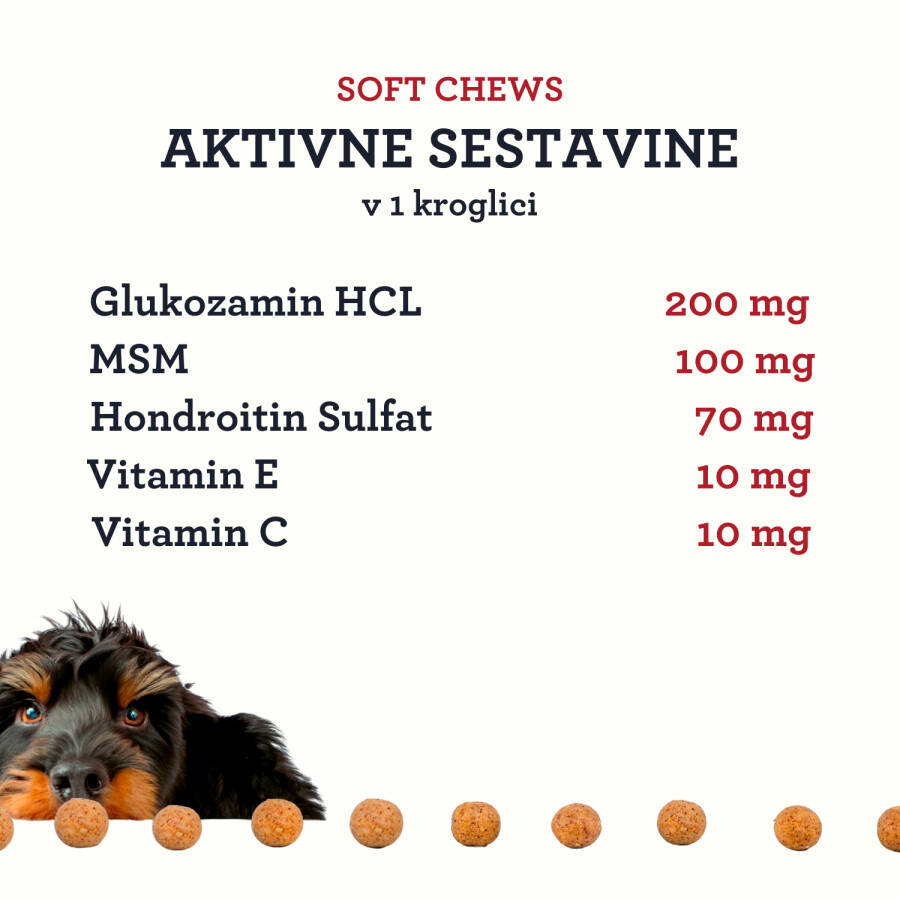 | Deklaracija izdelka | Aktivne sestavine na 1 mehki priboljšek (~2,2 g): Glukozamin HCl: 200 mg, MSM (metilsulfonilmetan): 100 mg, Hondroitin sulfat: 70 mg, Vitamin C: 10 mg, Vitamin E: 10 mg. Analitske sestavine: surove beljakovine: 9,5 %, surove maščobe: 14 %, surove vlaknine: 2,5 %, surovi pepel: 1 %, vlaga: 4 %. Aditivi na kg: prehranski aditivi: vitamin C (3a300): 5 000 mg/kg, vitamin E (3a700): 5 000 mg/kg; tehnološki aditivi (konzervansi): citronska kislina (E330): 5 000 mg/kg, buferirani kis (E260): 5 000 mg/kg; senzorični aditivi (arome): goveja jetra v prahu. |