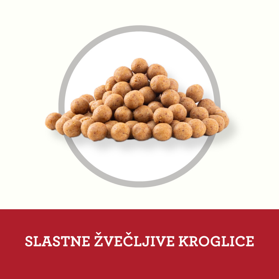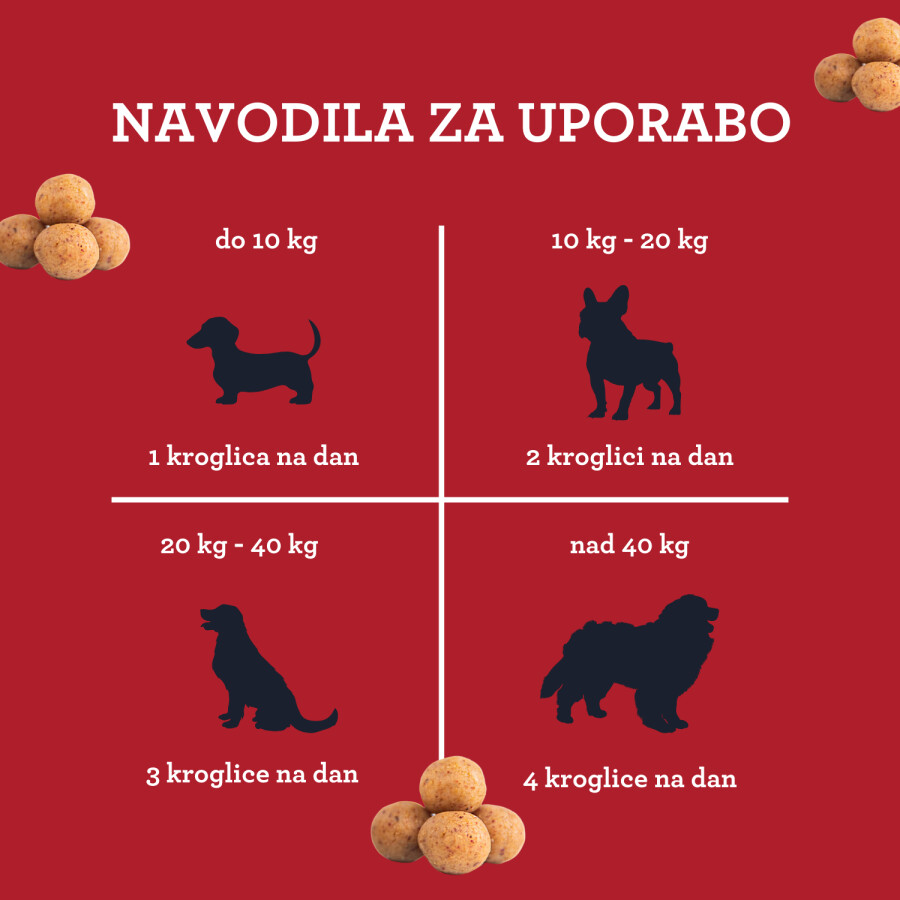 | Navodila za uporabo | Navodila za hranjenje: teža psa – dnevni odmerek: do 10 kg – 1 mehki priboljšek, 10–20 kg – 2 mehka priboljška, 20–40 kg – 3 mehki priboljški, nad 40 kg – 4 mehki priboljški. Ne prekoračite priporočenih dnevnih količin. Dajajte med ali po obroku, da z manjšate možnost prebavnih težav. Pred uporabo tega izdelka je priporočljiv posvet pri veterinarju. Ni za prehrano ljudi. Hranite izven dosega otrok in živali. Shranjujte v hladnem in suhem prostoru. 90 mehkih priboljškov – polnjeno glede na težo. BREZ umetnih arom, BREZ pšenice ali soje. Proizvedeno v EU, Neto količina: 200g. Uporabno najmanj do: datum označen na embalaži. |