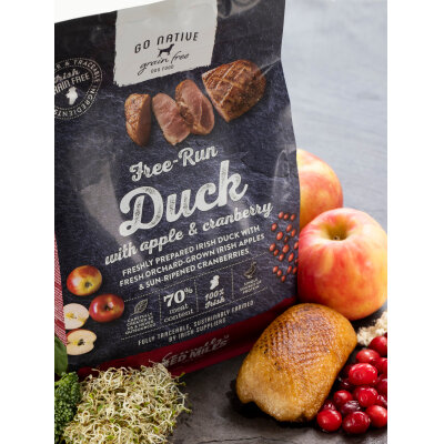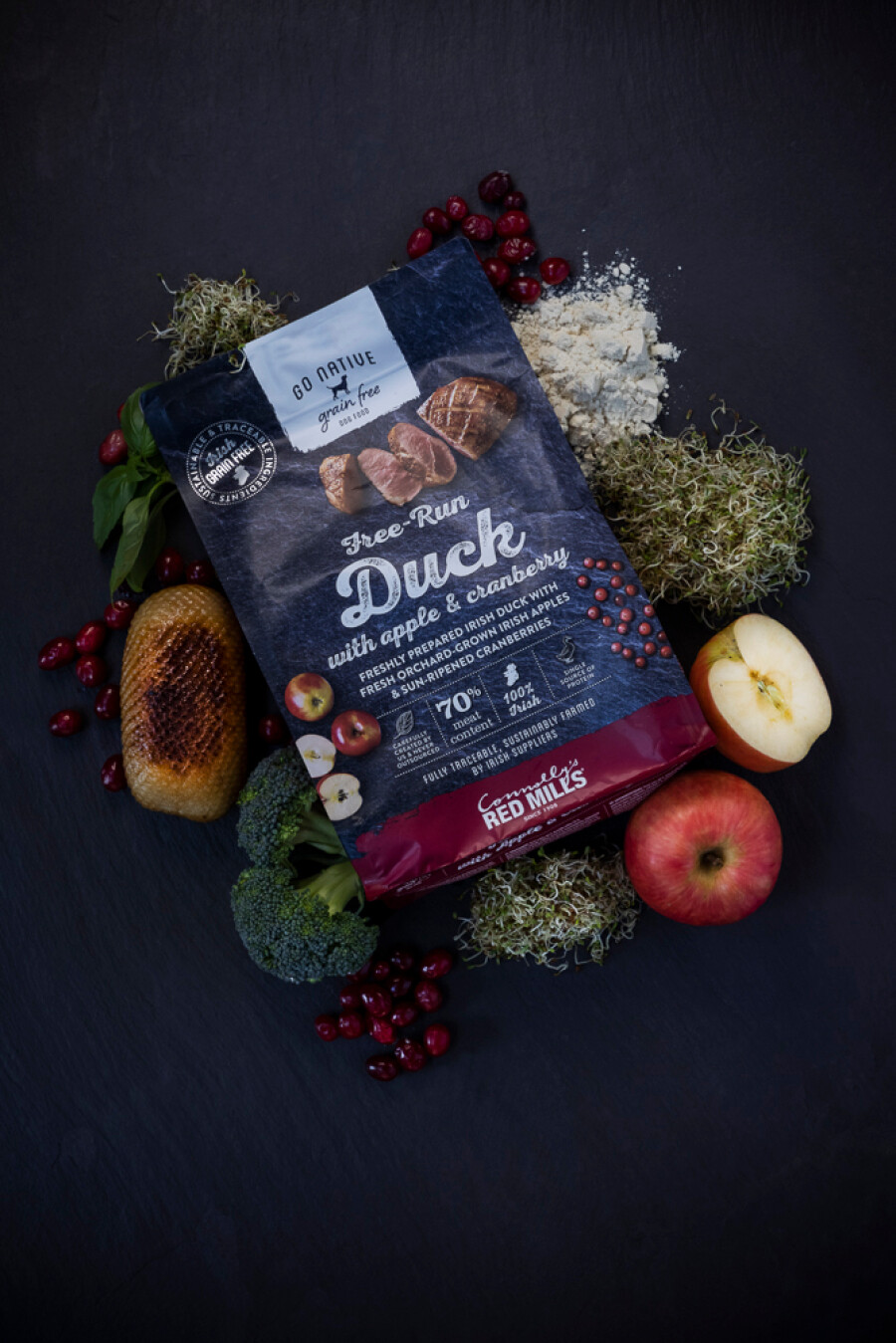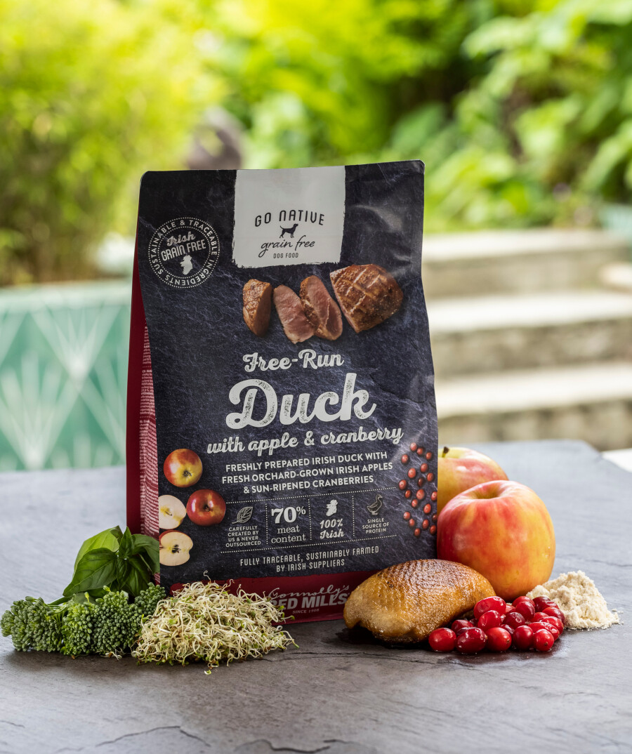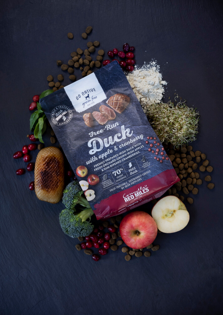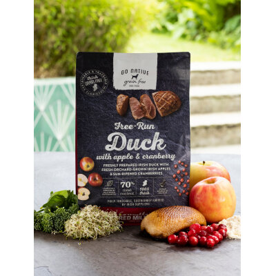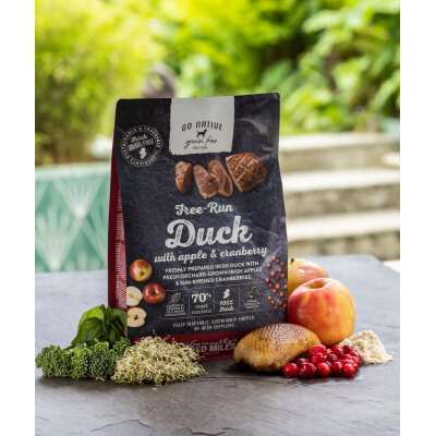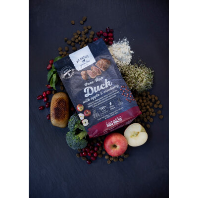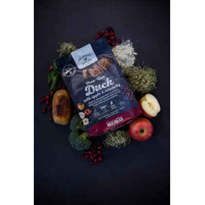 | Deklaracija izdelka | Popolna krmna mešanica za pse. Sestava: raca (65%; sveža 40%, dehidrirana 25%), krompirjev škrob 7%, sladki krompir 7%, račja maščoba 7%, grahov škrob 1%, laneno seme 1%, sušene rjave alge 1%, hidrolizirane beljakovine jeter 1%, natrijev klorid, izvleček juke, sušeno jabolko (enakovredno 5% svežega jabolka), sušene brusnice (enakovredno 5% svežih brusnic), glukozamin hidroklorid, hondroitin sulfat. ZELIŠČA: lucerna, sušen brokoli, sušene borovnice, sušeno korenje, sušen ingver, sušen ognjič, origano, sušeni šipek, sušena špinača, kurkuma, juka. Analitske sestavine: surove beljakovine 29%, surove maščobe 19%, surove vlaknine 2.0 %, surovi pepel 7.0%, vsebnost vlage (maksimalno) 10%, kalcij 1.8%, fosfor 1.2%, EPA 0,9%, DHA 1,4%, glukozamin 600mg/ kg, hondroitin 450mg/ kg. Dodatki (na kg): nutritivni dodatki: vitamini in provitamini: vitamin A 24.000 IU (3a672a), vitamin D3 2.000 IU (3a671), vitamin E 250IU (3a700) Elementi v sledovih: baker – bakrov (II) sulfat pentahidrat 28mg (3b405), cink - cinkov oksid 97mg (3b605), cink - cinkov kelat aminokislinski hidrat 200mg (3b606), železo – železov (II) sulfat monohidrat 250mg (3b103), mangan – manganov (II) oksid 65mg (3b502), jod - brezvodni kalcijev jodat 2.5mg (3b202), selen - natrijev selenit 0,33mg (3b801). Antioksidanti: naravni antioksidanti. Hranilna vrednost (100g): 420kCal |