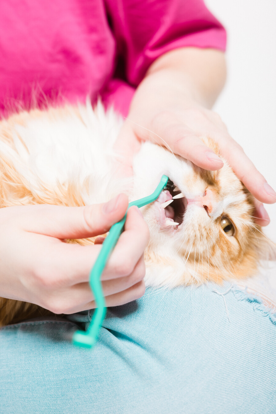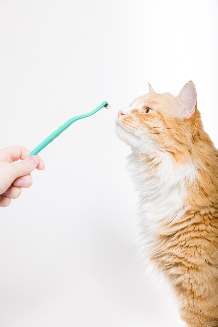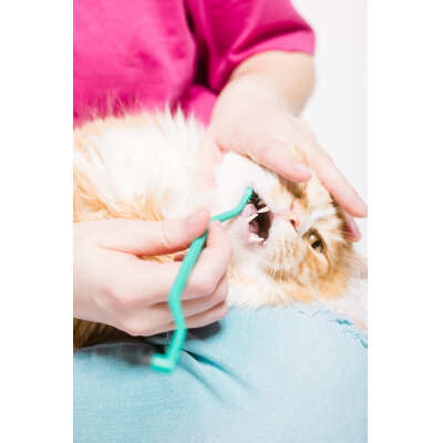 | Navodila za uporabo | Nežno pričnite ščetkati sprednje zobe vašega mačka in se počasi pomikajte proti zadnjemu delu zobovja. Vsak zob temeljito očistite z mehkimi ščetinami, med zobmi pa s pobiralom odstranite vse obloge. Po uporabi ščetko splaknite z čisto vodo in poskrbite da se dobro osuši na zraku. Sveža voda naj bo mačku vedno na voljo. Opozorilo: shranjujte izven dosega otrok in živali. |
