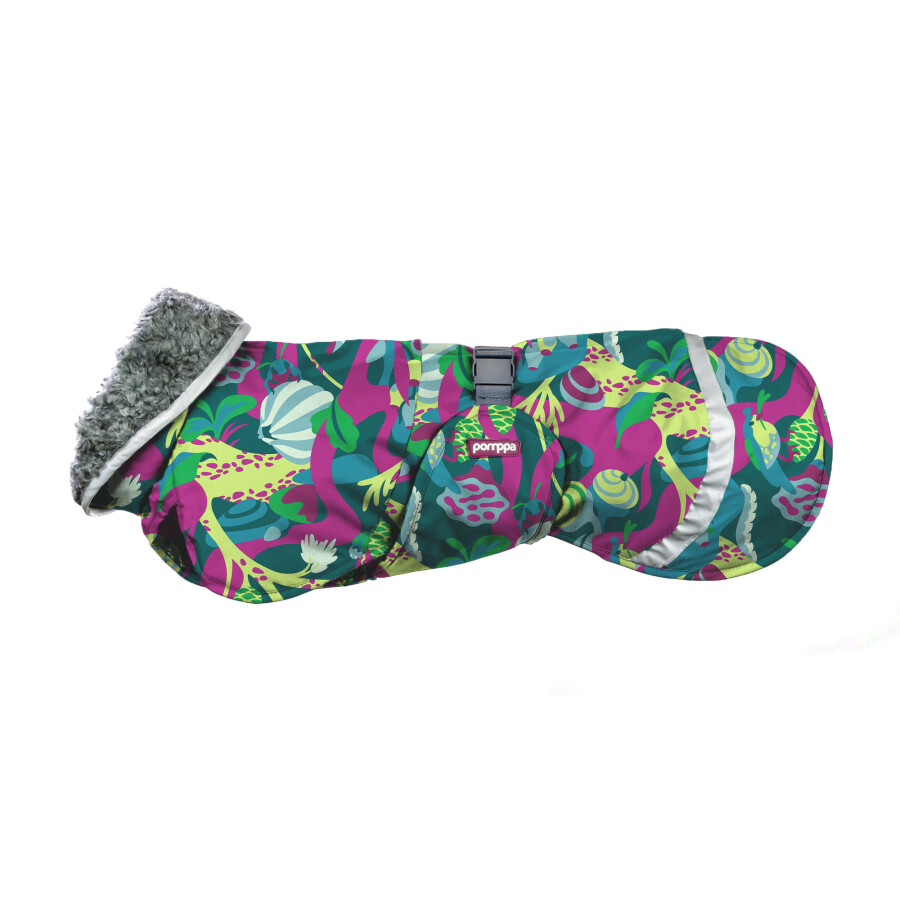 Vzdržljiv plašč, ki psu omogoča neovirano gibanje in se mu popolnoma prilega. Z odprtino za rep in pripenjanje na ovratnico, velikim ovratnikom ter odsevnimi trakovi. Pomppa plašči nimajo elastik za pričvrstitev na zadnje tačke, saj sama oblika in zasnova plašča omogočata popolno prileganje in pričvrstitev; na ta način psu omogočajo popolno svobodo gibanja. Plašči so narejeni iz antistatičnih in vodoodpornih materialov (vodni stolpec 5.000mm). Vsi materiali so primerni za pranje v pralnem stroju in so hitro sušeči.