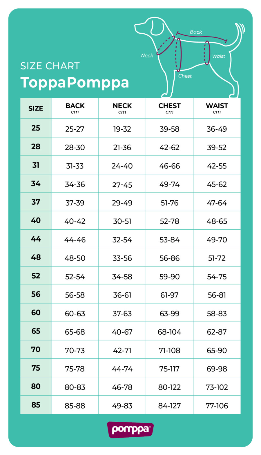Vzdržljiv plašč, ki psu omogoča neovirano gibanje in se mu popolnoma prilega. Z odprtino za rep in pripenjanje na ovratnico, velikim ovratnikom ter odsevnimi trakovi. Pomppa plašči nimajo elastik za pričvrstitev na zadnje tačke, saj sama oblika in zasnova plašča omogočata popolno prileganje in pričvrstitev; na ta način psu omogočajo popolno svobodo gibanja. Plašči so narejeni iz antistatičnih in vodoodpornih materialov (vodni stolpec 5.000mm). Vsi materiali so primerni za pranje v pralnem stroju in so hitro sušeči.