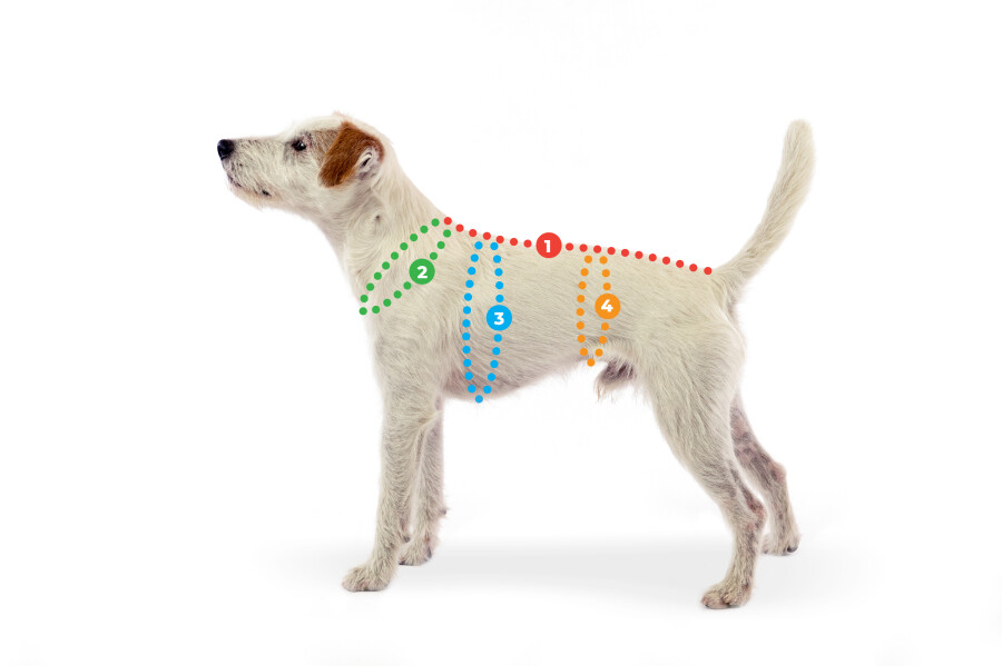 1 HRBET – dolžino hrbta merite od vratu do korena repa. Meriti začnete ob stičišču vratu in hrbta.