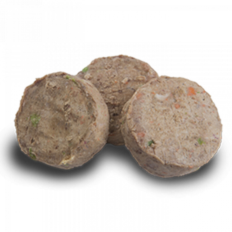 | Navodila za uporabo | Pred uporabo popolnoma odtajajte izdelek. Po odtajanju shranjujte v hladilniku do 24 ur. Vedno mora biti na voljo sveža pitna voda. Nikoli ne spreminjajte hrane naenkrat, temveč postopoma povečujte odmerek nove hrane. Samo za uporabo kot hrana za hišne živali. Hraniti ločeno od živil. Po ravnanju s tem izdelkom umiti roke ter očistiti orodje, pripomočke in površine. Navodilo za hranjenje: tabela z dnevnim vnosom hrane odtisnjena na embalaži. 1 polpetek = 50g. |